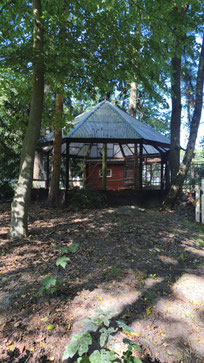 Am vorderen Teil des Grundstücks befindet sich bereits eine kleinere, offene Voliere. Dort lebt zurzeit eine Elster, die in sehr schlechtem Zustand in die Station gebracht wurde. Dank liebevoller